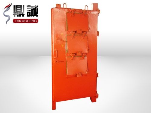 2.門扇上部裝有三組通風活門裝置,即在活門底板開有三組共18個直徑122mm的通風孔,活門板外部裝有自動張開12度角的活門懸板。每組活門通風量為2000立方/h,總通風量為6000立方/h,風速按8m/s進行設計,使用時可根據(jù)井下bao破材料庫需要風量和總回風道負壓值,確定通風活門組數(shù),并可調節(jié)每組活門懸板的張啟角度進行微調,以滿足通風量。當庫內一旦發(fā)生baozha,沖擊波經過衰減后,余壓只要大于20KPa時,活門懸板受壓再3-8s內自動關閉,與外界隔離,組織baozha抗沖擊波及爆炸產生火焰,有毒氣體向外部巷道擴散,由總回風道排出。
